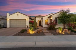 Stunning Endeavor model on the 6th hole of Sun City Festival's Mountain course. This east-facing backyard captures both golf and mountain views and includes a putting green, water feature and BBQ area. Enjoy the views and the vibrant Sun City Festival 55+ lifestyle! This 2-bed, 2.5-bath, plus den floorplan includes a 32-panel owned solar system. The home is filled with numerous upgrades and special features. The kitchen includes staggered coconut-colored cabinetry with under cabinet lighting, full overlay doors, soft-close drawers with roll-out trays, granite countertops, SS KitchenAid appliances with gas cooktop, tile backsplash and dual basin Blanco sink with reverse osmosis. An elegant wet bar with cabinets, counter seating and wine fridge adds to the home's entertainment value With wood-look tile flooring throughout the home, you'll also enjoy an extension at the back of the home, AV Built-In, den with French Doors, surround sound system, can lighting, custom fans and pendant lighting and pre-wired security system. The owner's suite is spacious and includes a soaking tub and separate frameless glass tiled shower and dual vanities with granite counters. The guest bedroom features a separate bath with shower. The laundry includes the washer & dryer and overhead cabinets. There's also a soft water system and golf cart garage.
