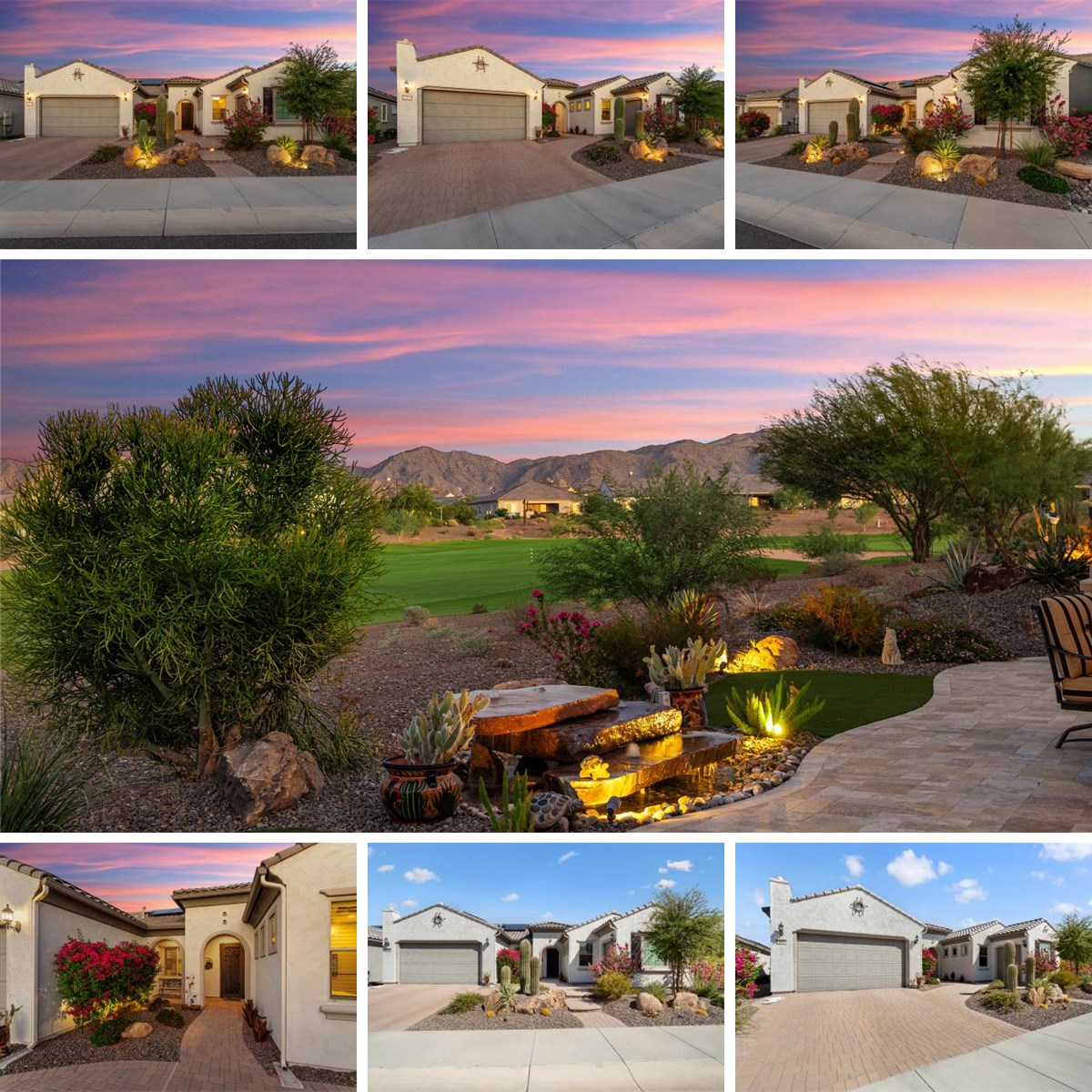 Stunning Endeavor model on the 6th hole of Sun City Festival's Mountain course. This east-facing backyard captures both golf and mountain views and includes a putting green, water feature and BBQ area. Enjoy the views and the vibrant Sun City Festival 55+ lifestyle! This 2-bed, 2.5-bath, plus den floorplan includes a 32-panel owned solar system. The home is filled with numerous upgrades and special features. The kitchen includes staggered coconut-colored cabinetry with under cabinet lighting, full overlay doors, soft-close drawers with roll-out trays, granite countertops, SS KitchenAid appliances with gas cooktop, tile backsplash and dual basin Blanco sink with reverse osmosis. An elegant wet bar with cabinets, counter seating and wine fridge adds to the home's entertainment value With wood-look tile flooring throughout the home, you'll also enjoy an extension at the back of the home, AV Built-In, den with French Doors, surround sound system, can lighting, custom fans and pendant lighting and pre-wired security system. The owner's suite is spacious and includes a soaking tub and separate frameless glass tiled shower and dual vanities with granite counters. The guest bedroom features a separate bath with shower. The laundry includes the washer & dryer and overhead cabinets. There's also a soft water system and golf cart garage.